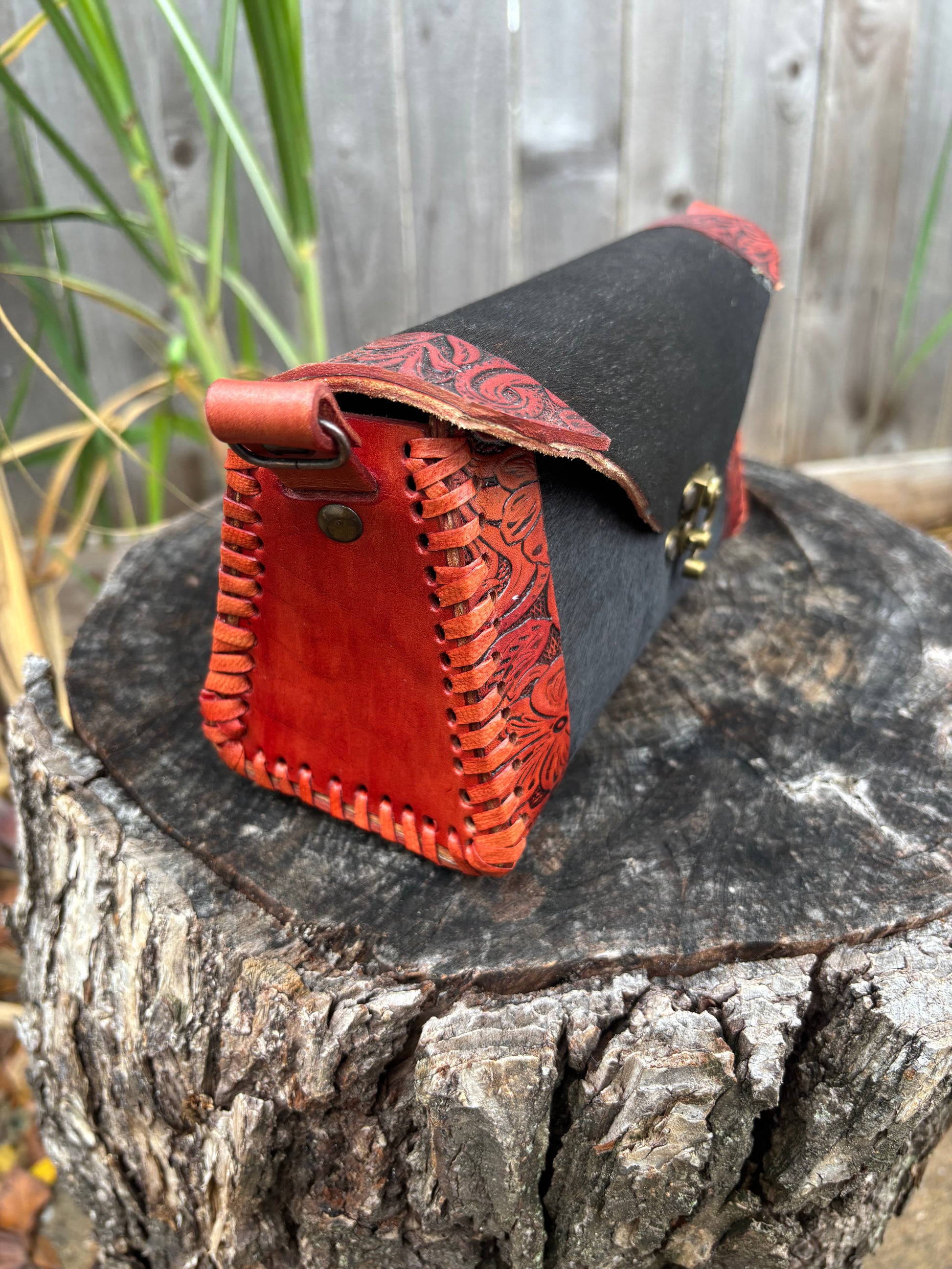 Bolsa de cuero artesanal cincelada y pintada a mano por artesanos mexicanos.